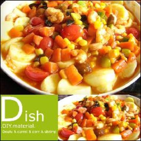 日本豆腐,甜玉米,虾仁,小番茄,黄瓜,胡萝卜,木耳