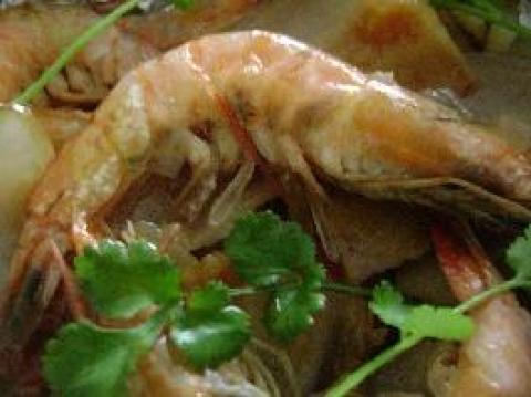 大虾,咸肉,葱,姜,红酒,洋葱,土豆,胡萝卜,盐