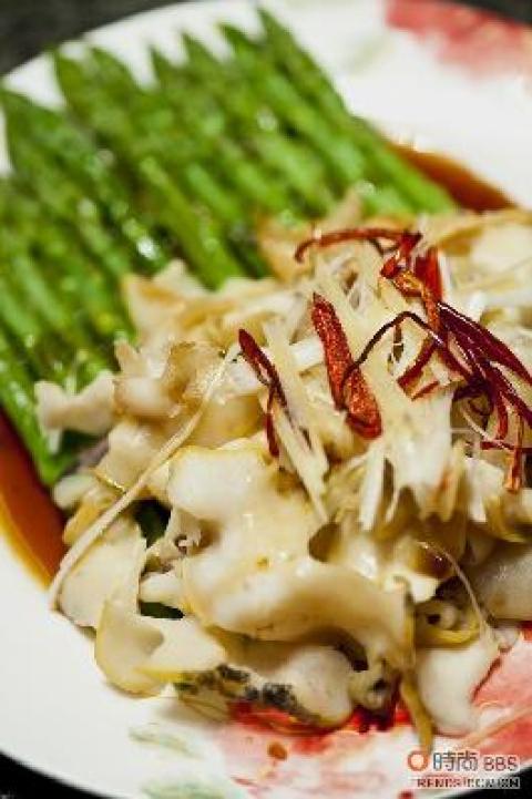 4.锅内烧开水放少许料酒、葱姜烧开,大火将螺片焯5秒钟左右(千万不要焯得时间太长),盛到芦笋上。