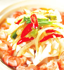 2.加热橄榄油,将洋葱爆香,加入高汤、豆浆,以中火煮沸。放入炸豆腐煮软,依序放入大虾、扇贝等