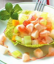 3.将作法2的虾仁丁、西芹丁、黄椒丁、作法1的雪梨丁、小蕃茄丁混合拌匀后,盛入作法1的美生菜碗中,淋上水果酱即可。