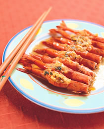 (2)将香蒜奶油加温熔化,淋在虾子上,洒上酒及适量的盐,再将大蒜末与香菜末放在虾背上。