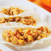 (3)热锅下1大匙的沙拉油拌炒处理好的1+2料,加调味料炒香并至干松状,再加入碎花生拌炒之后,盛入白菜心内排盘。