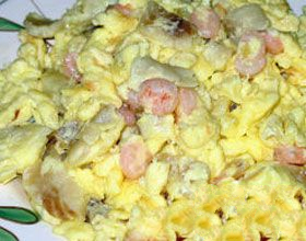 6.另用勺下入油烧热,将鱼条、鸡蛋液倒入锅内,拌炒熟后,随下碗芡汁,颠匀,淋人香油即成;