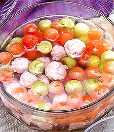 2、将黄瓜、西瓜挖成虾仁丸子大小的球。