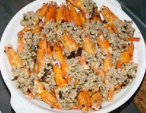 4、将炒熟的肉末填进虾身中,蒸5分钟即可。
