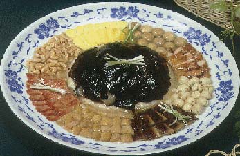 3、将煲好的猪婆参捞出,沥尽水分后酿入八宝配料,上笼蒸3分钟,取出,改刀装盘,浇汁即成。