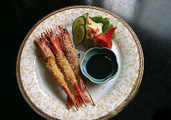 三、然后上笼蒸,约蒸十分钟后即熟,一只只倒出,稍微凉一下,在每只靠盅底一头戳一个小孔。随手插上一根凤尾虾,再下六成热油锅,用旺火炸五分钟起锅,另外用清汤、菱粉、精盐调卤浇上即好。