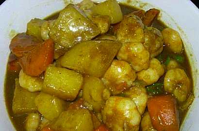 2、把所有泡过油的材料捞起,沥干油份;重新热锅,重新爆油,待油热后放入蒜片爆香,倒入土豆块和胡萝卜块,以2汤匙生抽、2茶匙砂糖、1茶匙鸡精加水加2碗清水调配成汁,倒入锅中,烧开后转小火焖5分钟;放入虾仁,加入2汤匙油咖喱,搅拌均匀后继续焖煮,待汁稍微收干变浓稠即可。(做咖喱菜式的时候偶喜欢保留比较多的汁,用来拌饭或其他主食感觉很棒哦)