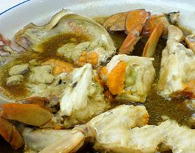 3.膏蟹在沸油内泡过,再烧热瓦缸,下姜,葱头,蒜头爆香,放入膏蟹件同爆,洒点烧酒,倾下许半碗清水,一匙生抽,加盖煮十二分钟便可原煲上桌。