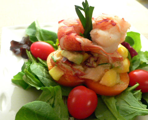 4、将切好的龙虾肉,摆放水果上方再挤上沙拉酱最后,在撒上虾卵即可。