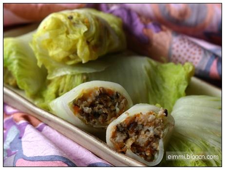 2、取娃娃菜一叶,包入拌好的馅料。从叶子端包起,旁边的叶子向中间折。我懒得用面糊封口了,事实证明装盘时只要封口处朝下,是很结实的。还有一点就是码盘码得紧实一些,也能帮助固定。