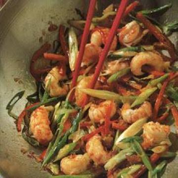 大虾24只,大葱1束,鲜生姜30克,大蒜2瓣,莱姆(青柠)1个,菜油或花生油2汤匙,红糖50克,清鸡汤120毫升,泰式甜椒酱2汤匙,点缀:,橘瓣形莱姆(青柠)块、红辣椒1根