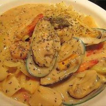 冻青口(贻贝)8只,洗净,冻中型熟虾12只,冻中型扇贝肉8只,大洋葱1个,去衣,切丝,蒜蓉1汤匙,牛油2汤匙,罐头奶油磨菇汤1罐,水半罐或花奶1/3罐,油、盐适量