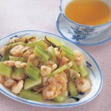 新鲜河虾(淡水虾)900克,龙井茶叶1茶匙,花生油3汤匙,芹菜80克,大葱1根,绍酒1茶匙,太白粉(生粉)1茶匙,腌料︰,盐3/4茶匙,糖1/2茶匙,胡椒粉、麻油适量,太白粉(生粉)1茶匙,蛋清1个