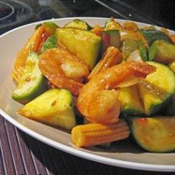 2.快火下油(约1汤匙)起锅,爆香蒜茸,加洋葱和1茶匙盐炒软,加入玉米笋和意大利瓜炒香,加入汁料炒匀,汁开后加入虾炒匀,装盘即成。