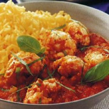 2.按包装指示煮饭,水沸后加入压碎的番红花。西红柿酱汁再度煮沸。把虾放在酱汁上面,盖紧锅盖,小火煮3至4分钟,至虾煮熟。