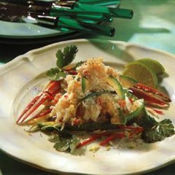 熟螃蟹4只,小红辣椒1根,香菜(芫荽)1小束,大蒜1瓣,生姜15克,大葱2根,香茅(香草)3枝,莱姆(青柠)4个,泰国鱼露、雪利酒醋各60毫升,糖1汤匙,淡酱油3汤匙,熟酪梨(牛油果)2个,点缀:,香菜(芫荽)枝、橘瓣形莱姆块适量