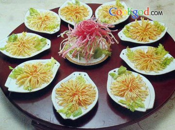 将传统菊花鱼原料改为地产金牛千张,配以蟹黄酱调味,使成菜的口味、造型更富创意。