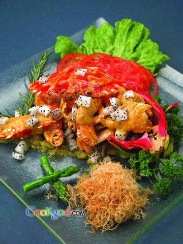 火龙果200克,花蟹1只(重约300克),土豆松30克,生菜1片,西红柿、芦笋尖各30克。调料咖喱粉50克、椰浆10克,清水100克,糖2克,味精2克,盐2克,色拉油700克,生粉30克,湿淀粉8克。