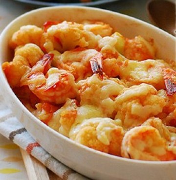 第一种:海鲜菜谱芝士茄汁虾球花菜做法