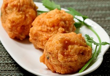 中号锅放大半锅油,中火烧热油,用勺舀出大约1.5大匙的虾肉放左手掌上,用勺子帮助整豆腐虾球坯,放入热油里炸至金黄,即可捞出沥油,趁热食用。