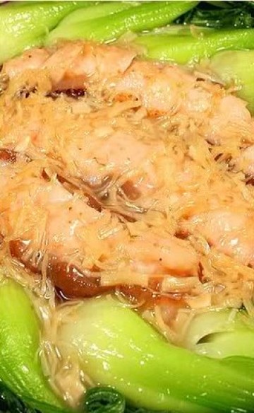 6、把蒸好的海参与瑶柱摆进菜胆之盘中,再把蒸好的海参瑶柱水勾茨后均淋在菜胆海参瑶柱之上即可出菜。