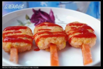 5.双手拍上少许干淀粉,把拌好的虾肉泥当中放胡萝卜条,做成棒冰的样子,为了防止粘手,在表面都拍上干淀粉