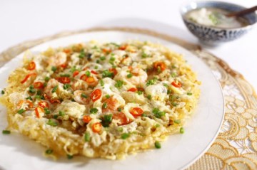 1.将蟹刷干净,放入蒸笼蒸约7分钟取出,取肉;鲜虾洗净,去壳,挑去肠泥;鸭蛋打散成蛋液;白萝卜洗净去皮,打成泥状;辣椒、葱洗净,切碎;姜去皮洗净,切片备用