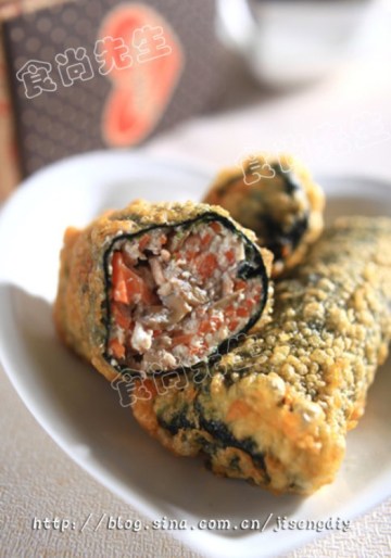 第一种:海鲜菜谱炸鲜虾豆腐紫菜卷做法