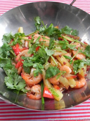 4.热油爆花椒,姜,红椒,下入虾,调入生抽,盐,干贝素,少许糖提鲜