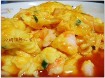 第一种:海鲜菜谱酸甜虾仁蛋做法