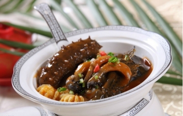 海参泡发切条,大肠洗净切条,木耳泡发,上料共入砂锅,加水适量,文火煮至熟烂,食用。