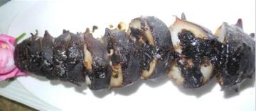 4、海参王入烤箱中档,烤制4分钟,翻个烤制4分钟抹刀片切成整齐状,装盘中间抹上海苔酱,刷上明油入烤箱再拷制2-3分钟即可。