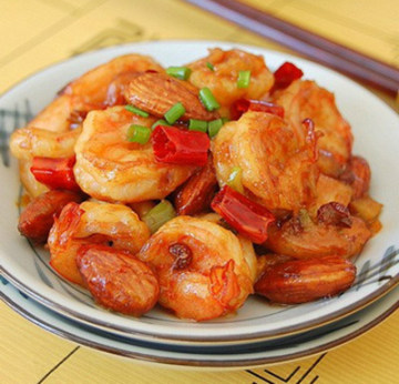 1)大虾洗净去头去壳,背部中间用刀划开,去除虾线;2)处理好的虾仁用料酒、淀粉、少许盐拌匀,腌制片刻入味;3)干辣椒去籽切小段,蒜切片,葱姜切小粒备用;4)将盐、白糖、料酒、醋、淀粉、水、香油拌匀做成调料汁备用;5)锅内油烧至6成热,放入干辣椒和花椒煸炒出香味;6)放入虾仁炒散;7)炒至虾仁断生时,放入葱姜蒜快速翻炒;8)加入调味汁炒匀9)最后起锅前放入大杏仁拌匀即可;
