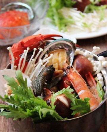 8. 底汤倒入火锅中,加入海鲜即可上桌,其余各料随烫随食。