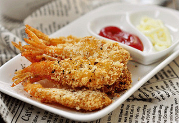 1.1、虾洗净去头去皮只留尾部一节2、在虾背部开刀三分之二,去泥肠3、加盐稍腌10分钟4、先在面粉滚面,在放蛋清,最后在面包屑中让虾沾满面包屑5、油锅温热,下虾炸酥