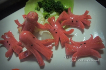 1、做八爪鱼:烤肠切成等分两段,取其中半根从中间剖开,再每边各划三刀。切时要注意稍用力过大就会让八爪鱼丢一条腿,另一边也同样方法剖开。