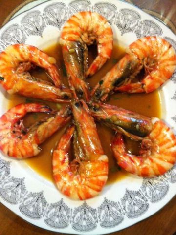 锅里少许油 煸炒姜片 倒入明虾 翻炒 料酒 鲍汁 糖味精 加少许水 煨一下 加糖 收汁
