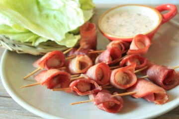 6、将生菜撕成能包住培根卷的大小,和培根卷一起摆到平盘中就可以准备开吃啦!