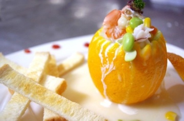 将橙去头部将里面的橙肉取出,然后把煮好的海鲜放进去,土司切条放旁边摆好即可。