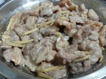 1、猪梅肉洗净切片,加腌肉料和姜丝腌15分钟。