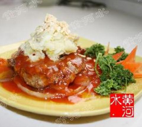 6.洋葱粒、蒜蓉用黄油(或者橄榄油)炒香,放番茄沙司、高汤、盐炒成番茄酱汁,浇在牛排上,放上土豆泥,撒杏仁