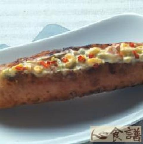2、填入烤熟香肠的划开处即可。