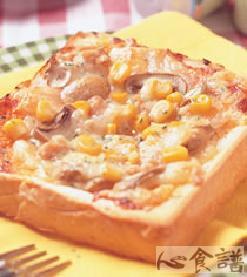 洋菇10公克,厚片土司1片,蕃茄披萨酱1小匙,起司丝适量,玉米粒1大匙,罐头鲔鱼肉2大匙,起司粉适量