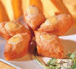(4)热油锅,以中火油炸作法3做好的土司鹑蛋,土司的部份比较轻,所以油炸时必须用筷子将没有抹料的那一面压入油中,待两面皆炸成金黄色后即可捞起。