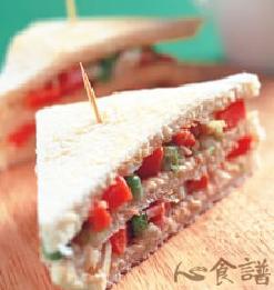 3.吐司烤过去边皮,涂抹马铃薯酱,再放入蕃茄片、莴苣片、煎蛋、吐司,重复一次上述的步骤,再将叠在一起的土司切成三角形即可。