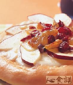 加州甜披萨面皮1张,苹果35公克,蔓越梅干1大匙,白葡萄干1大匙,兰姆酒150cc,熟核桃1/2小匙,乳酪酱1又1/2大匙,起司丝适量,起司粉适量