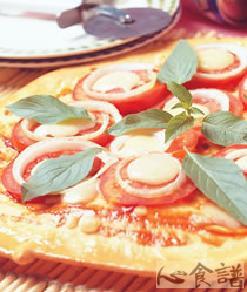 脆皮披萨面皮1片,蕃茄酱汁适量,小蕃茄10颗,罗勒叶6片,义大利香料粉适量,玛兹拉起司100g